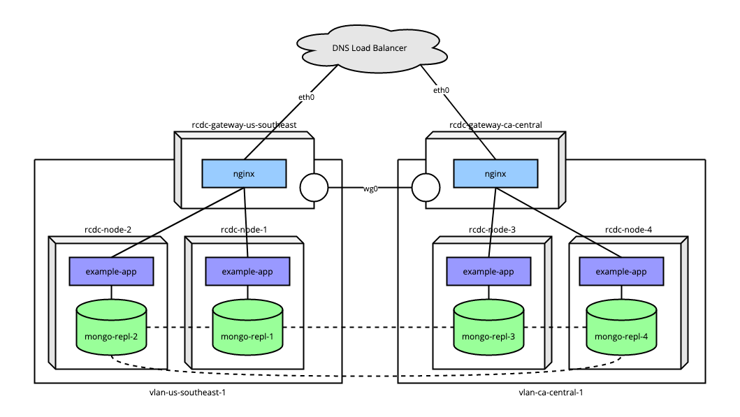 The MongoDB instances stay synced within a particular VLAN via the local connection, while instances in different regions are synced across the gateways’ WireGuard® connection.